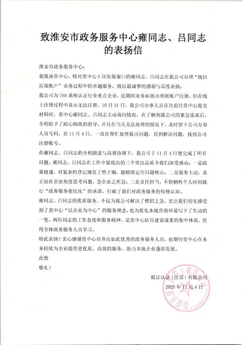 近日,淮安市医保中心收到一封来自联证认证(江苏)有限公司的表扬信,信中盛赞窗口工作人员雍洁、吕泾炜“急企业之所急,解企业之所难”,在协助企业办理医保线上注册业务时,以专业素养和高效作风破解难题。